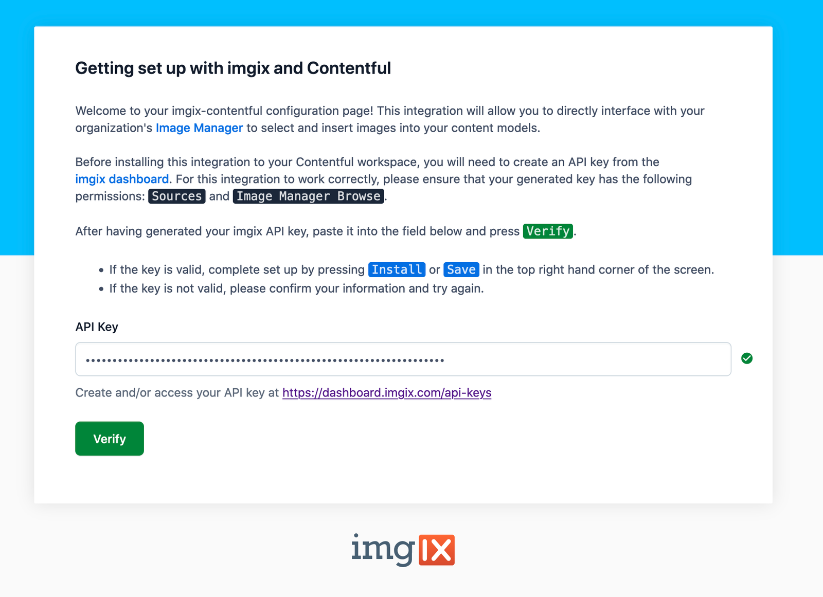 1. Configuration: Upon installation, users will configure their app using an API key generated via the imgix Dashboard. This key will require permissions for Sources and Image Manager Browse.