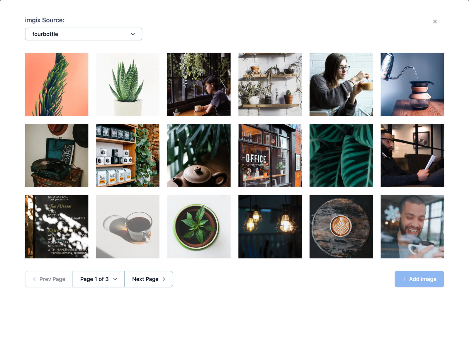 The imgix app is built on top of our public Management API to help users interface with some of the same features that they might expect when using Image Manager. In its current state, users can select a source from their imgix account, then browse and select an image from their source to add to their content model.