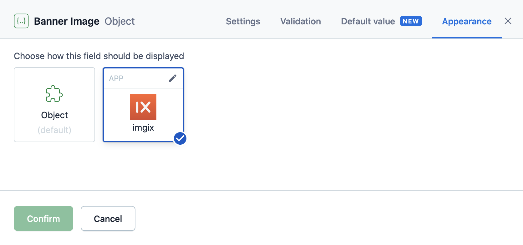2. Add imgix to your content model: Of the many content types that users can choose from, imgix specifically integrates with the JSON object content type. This will allow us to eventually deliver information about the selected image to the developer (e.g. src). Users can designate a field to use imgix by navigating to that field’s Appearance tab and selecting the app.